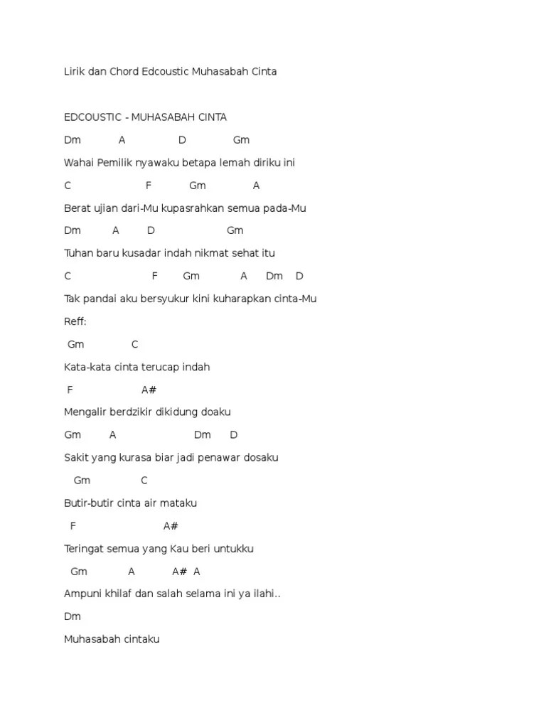 Wahai pemilik nyawaku / betapa lemah diriku ini / berat uji. Edcoustic, profile picture · edcoustic. Layanan mobile dari situs entertainment terbesar indonesia, kapanlagi.com. Berikut lirik dan chord lagu muhasabah cinta dari edcoustic: Lagu yang berisi semangat dan penghambaan pada allah. Lagu muhasabah cinta merupakan lagu yang mengusung nuansa islami. Lagu ini dirilis pada 2008 silam dan masuk dalam album edcoustic bertajuk . Lirik lagu nasyid sepotong episode edcoustic. Dm gm betapa lemah diriku ini Lagu tersebut telah dirilis pada 2008 . Dm a wahai… pemilik nyawaku. Muhasabah cinta lyrics by edcoustic: